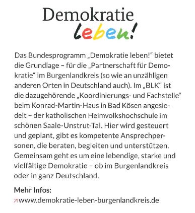Im Naumburger Tageblatt vom 11. April 2022 berichten Constanze Matthes und Martin Walter über die 8. Demokratikonferenz der Partnerschaft für Demokratie im Burgenlandkreis. Dazu eingeladen hatte die Koordinierungs- und Fachstelle der Partnerschaft für Demokratie im Burgenlandkreis des Bundesprogramms „Demokratie leben!“.